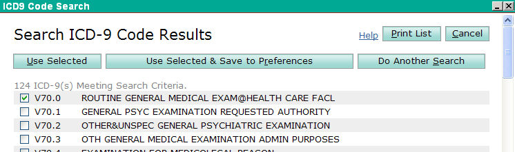 Click Print List to print the list of codes on the Find ICD9 Code Results window. |